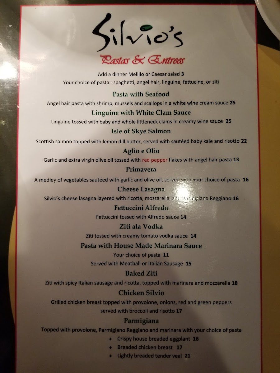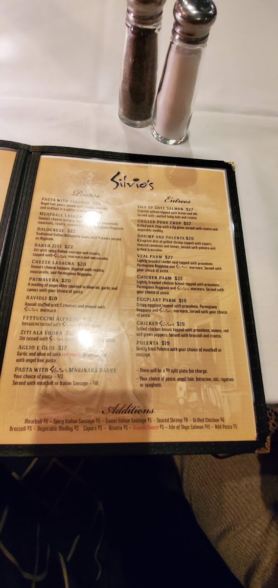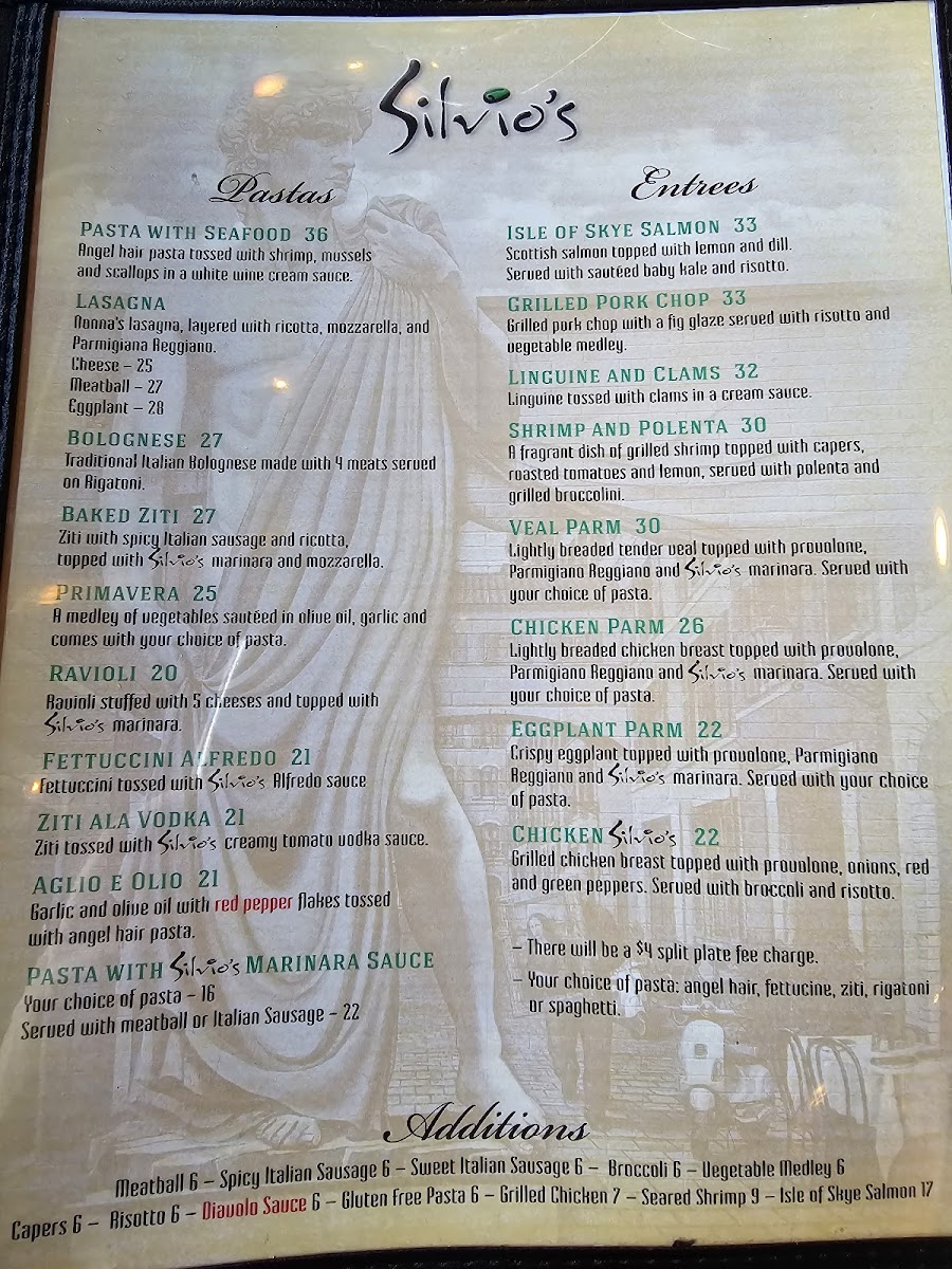 The pasta dishes are where Silvio's truly shines. Indulge in the Meatball Lasagna, which features layers of Nonna's cheese lasagna paired perfectly with homemade meatballs, ricotta, mozzarella, and Parmigiana Reggiano for $24.00, or go for the Ravioli stuffed with five cheeses and drizzled with Silvio's marinara at $18.00. Want to elevate your meal? Try the Isle of Skye Salmon or add a spicy Diavolo sauce to your dish, both for $15.00 and $5.00 respectively.